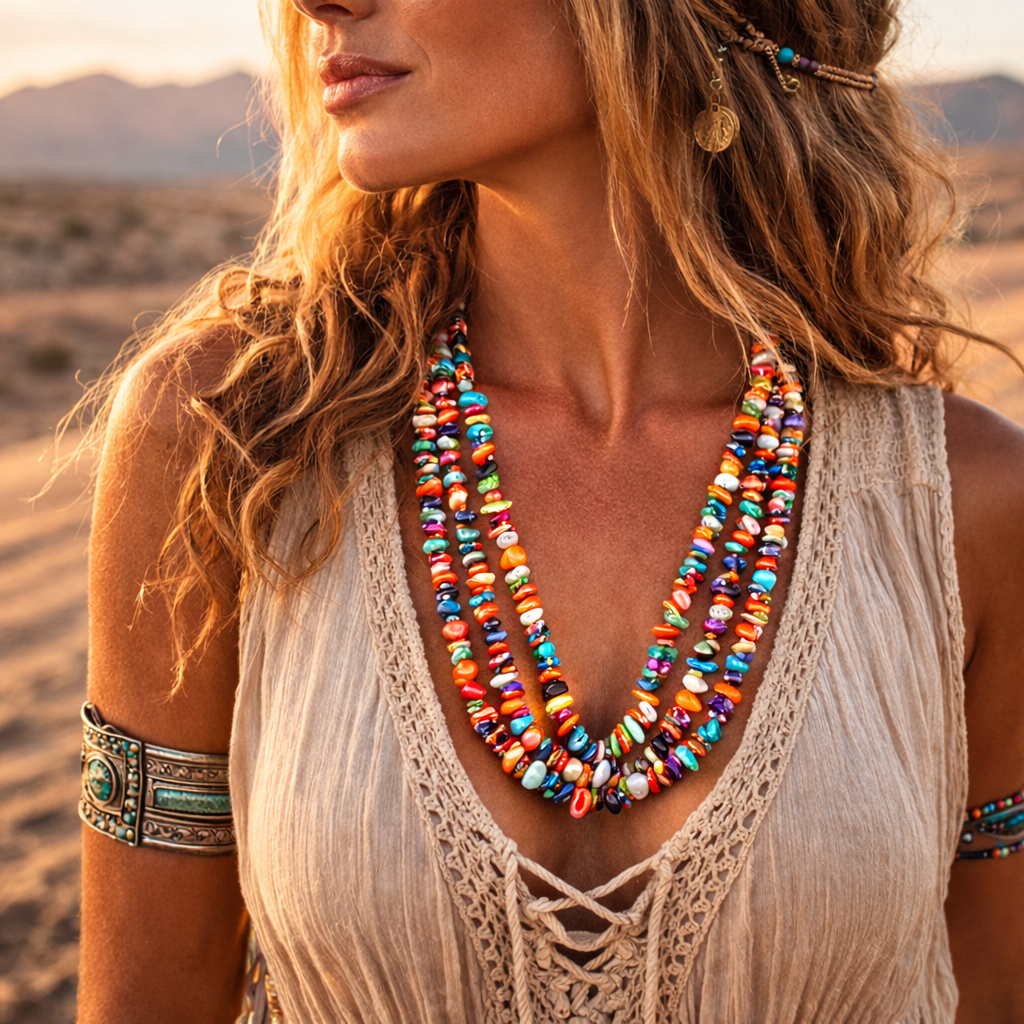 Boho Multi Strand Gemstone Necklace-Colorful Chip Stone Statement Necklace-Layered Festival Jewelry-Hippie Bohemian Gift for Her